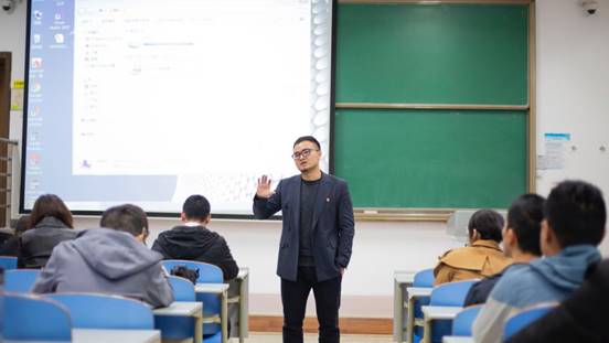 看着台下认真聆听并做记录的党员及社团骨干,他有感而发,指出新时代青年要厚植爱国情怀,苦练扎实本领,并勇于创新创造,提升自我基本修养,勇担时代责任。