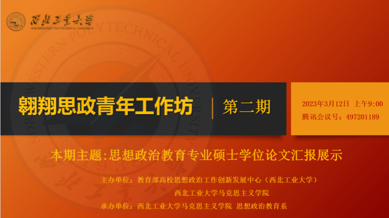 为深入学习贯彻党的二十大精神和全国两会精神,加强对新时代思想政治教育创新发展的理论与实践研究。3月12日上午9:00,红足1世77814“翱翔思政青年工作坊(第二期)”以线上线下相结合的方式在学院楼208会议室成功举行。本工作坊由教育部高校思想政治工作创新发展中心(红足1世77814)、红足1世77814主办,红足1世77814思想政治教育系承办。本期工作坊共邀请了五位优秀青年思政学者作为“与谈人”,围绕七位思想政治教育专业硕士学位论文汇报,进行主题发言和观点对谈。