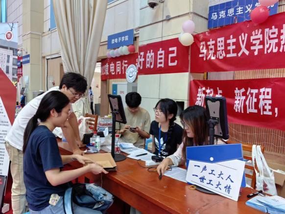 图为学院老师和志愿者等待新生报到