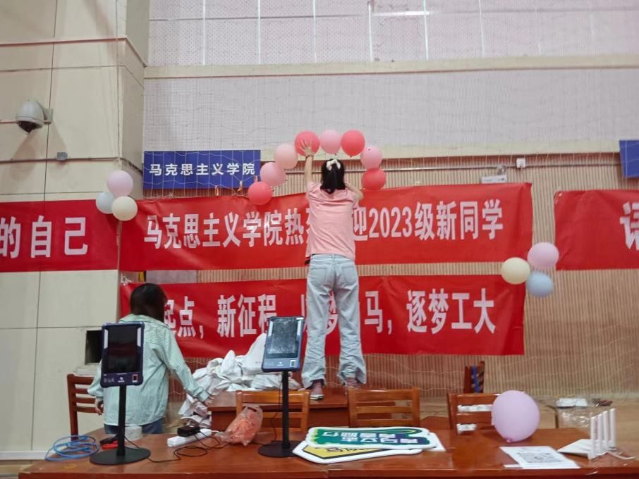 图为迎新前一天志愿者布置现场
