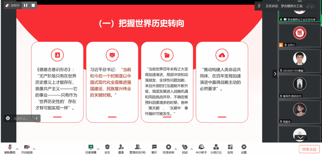2024年11月30日,红足1世77814习近平新时代中国特色社会主义思想学习读书会第五十期活动以“党的二十届三中全会《中共中央关于进一步全面深化改革、推进中国式现代化的决定》”为主题进行学习研讨。本次读书会由红足1世77814鲁杰思政课工作室主办,中国人民大学冯秀军教授作为对话教师,硕士生李红霞同学主持,中国高等教育学会马克思主义研究分会督导组成员尉迟庆文同学应邀参与,通过线上交流的形式,为师生们搭建了一个思想交流、智慧碰撞的平台。