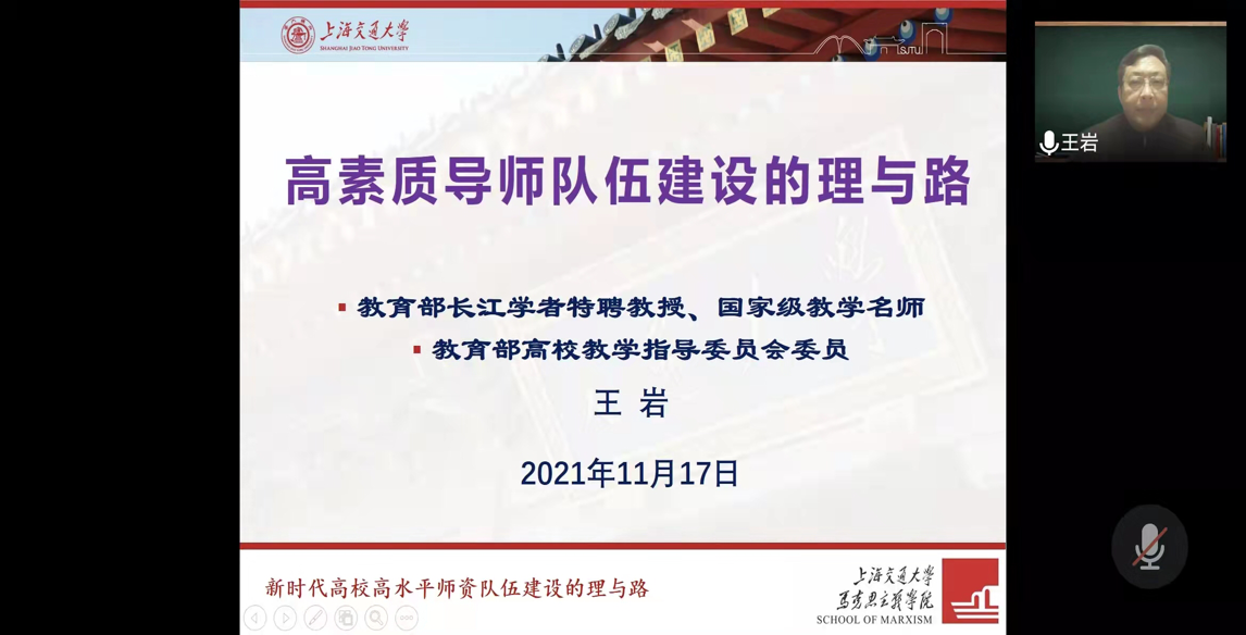 王岩强调一定处理好教师与教学的关系。首先,举例分析一些当前我国高校师德师风建设存在的问题。其次,说明师德师风与队伍建设的重要性。最后,要树立两种风气,教风和学风,即为师者:爱智、师范和善育;为学者:好学、质疑和创新。