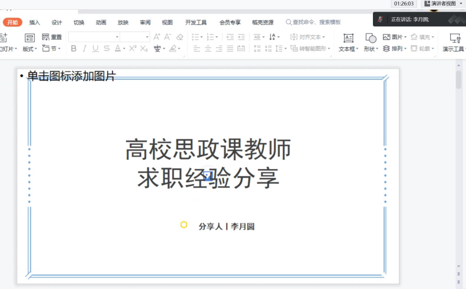 第五位校友是李月圆,她结合自身求职经历,非常详细地介绍了民办高校和公办高校的薪资待遇区别,笔试的资料推荐以及应聘思政课教师试讲面试中注意的细节,强调要不断加强马克思主义理论知识储备,才能在应聘中以不变应万变。