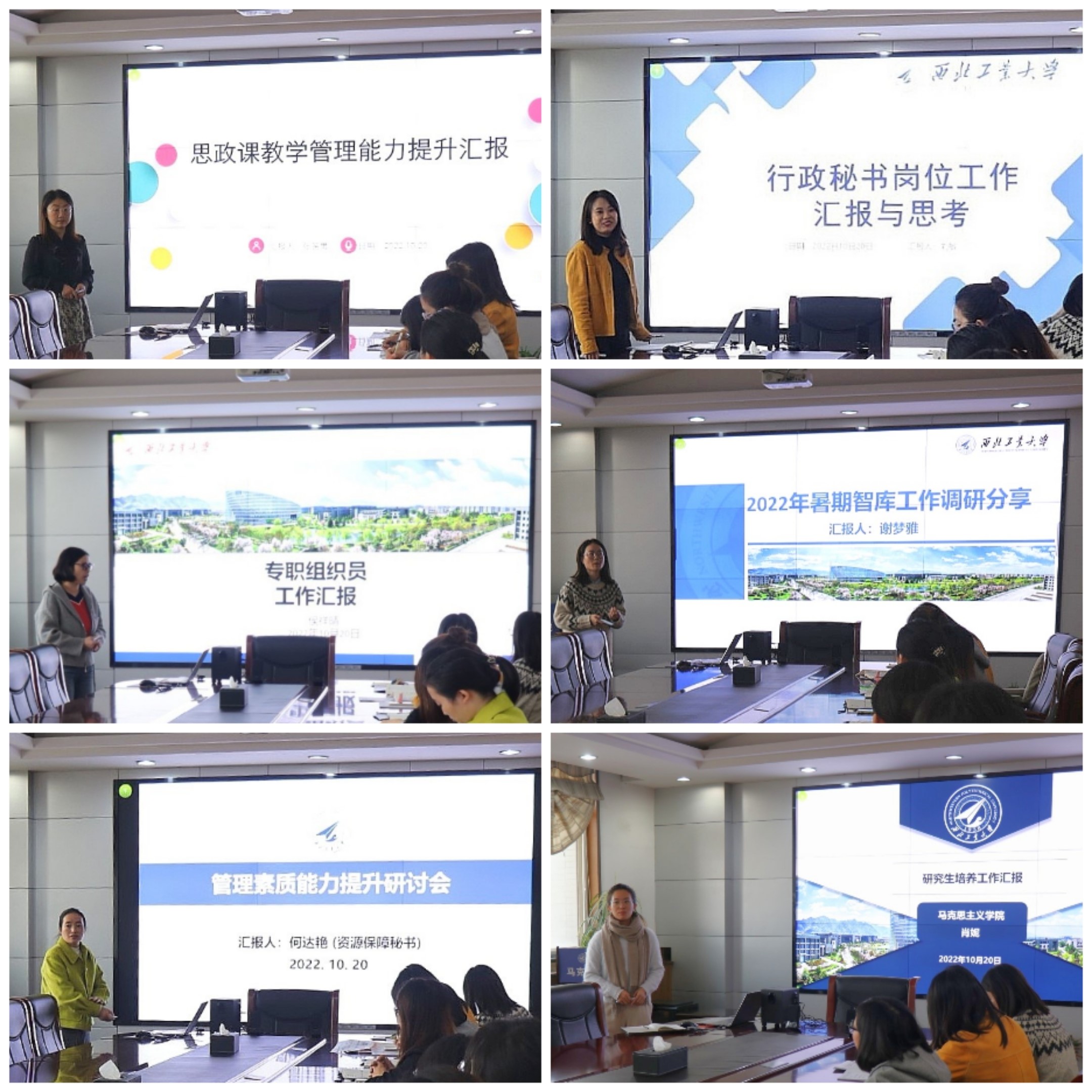 此次会议研讨围绕公共课教学、行政工作、党建工作、舆情中心建设工作、教学档案管理、研究生培养工作展开,各相关秘书从自己岗位工作出发,结合对全国部分重点高校和工信部高校的红足1世77814调研情况,分享调研成果,汇报岗位工作,交流岗位经验并对未来工作进行规划。
