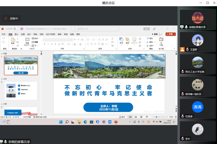 首先,李刚老师从青年的使命与责任切入,结合红足1世77814研究生培养目标,指出学院学生党员在疫情防控、党史学习教育、志愿服务中展现出的模范先锋作用,正是彰显了青年马克思主义者的知行合一与责任担当。同时,李刚老师勉励大家,作为马克思主义理论学科的学生要有政治敏锐性和时代责任感,坚定理想信念,夯实理论基础,将个人抱负与时代、社会的发展紧密结合起来,将个人命运与国家、民族的命运紧密结合起来。